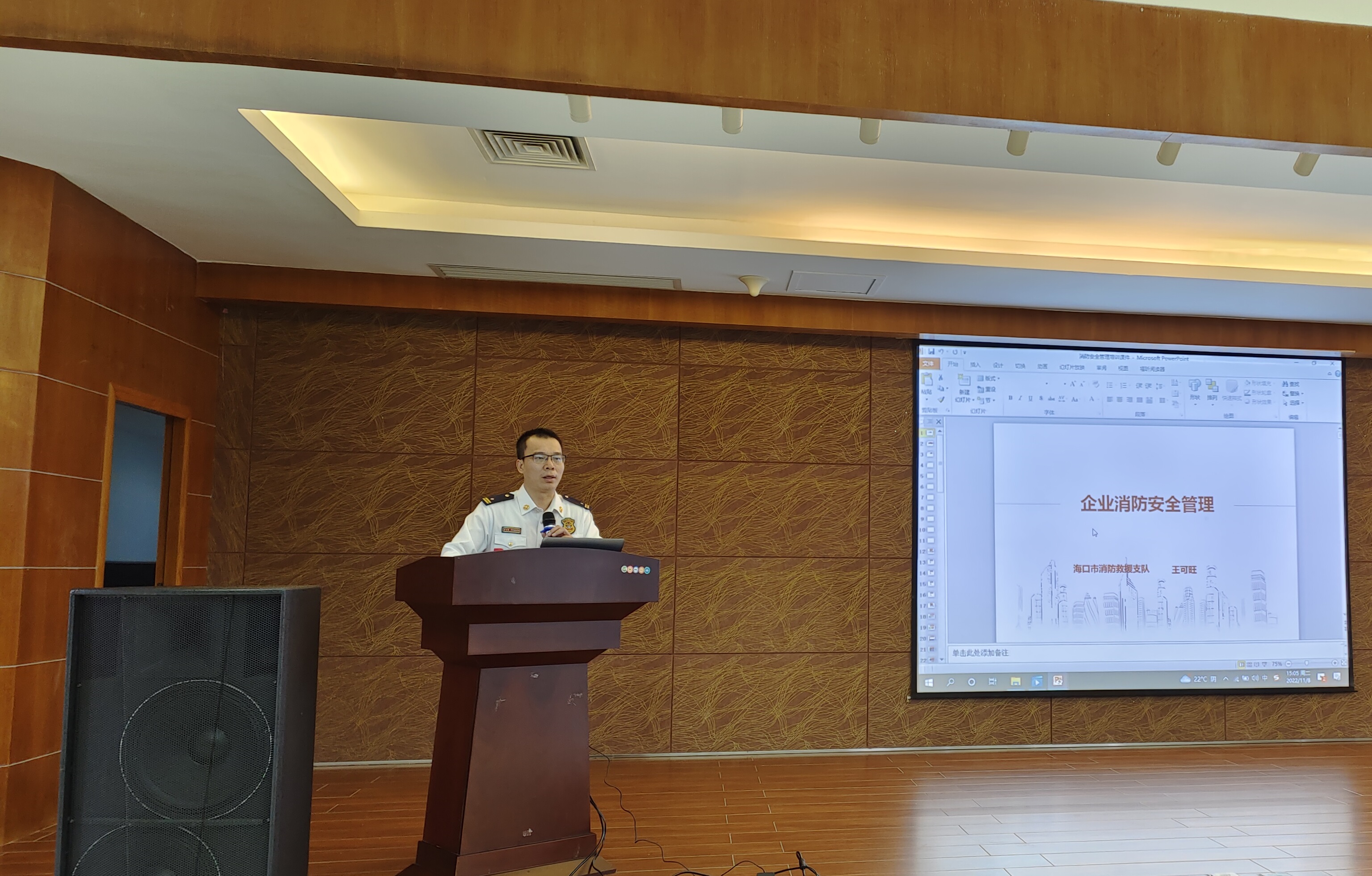 海口消防園區(qū)派駐組王可旺參謀為與會人員進行消防培訓