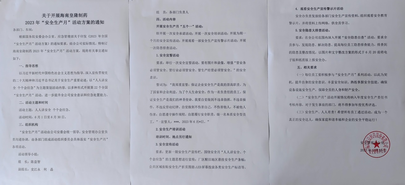 根據(jù)國家、省、市、區(qū)相關文件精神,結合公司實際,海南皇隆制藥股份有限公司制定了2023年“安全生產(chǎn)月”活動方案,并開展了以“人人講安全,個個會應急”為主題的系列活動,進一步提升了公司全員安全意識和應急處置能力。